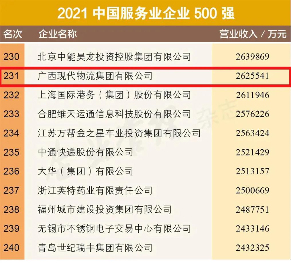 比去年提升5个名次 广西现代物流集团位列中国服务业企业500强第231...